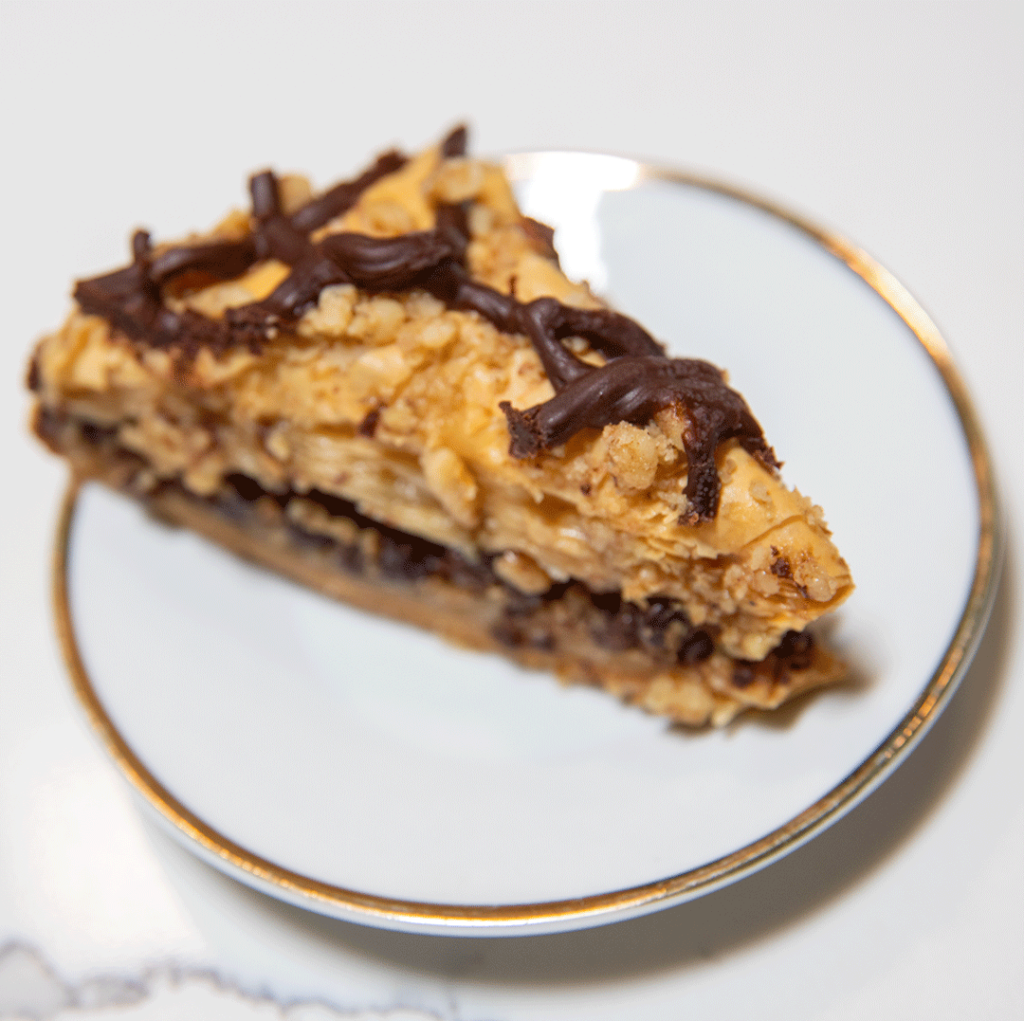 Chopped walnut between thin layers butter and phyllo sheets. Drizzled with a layer of chocolate and clover honey.